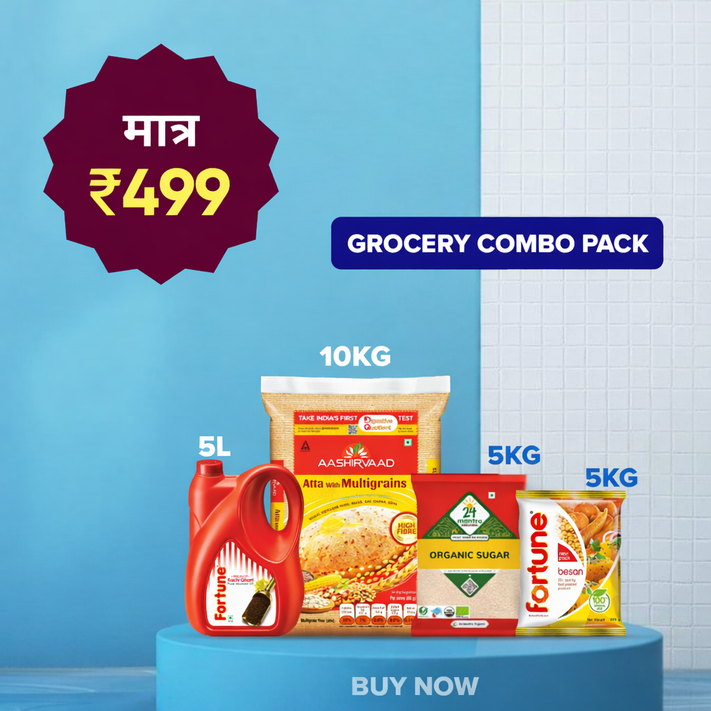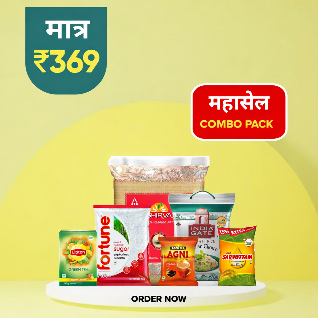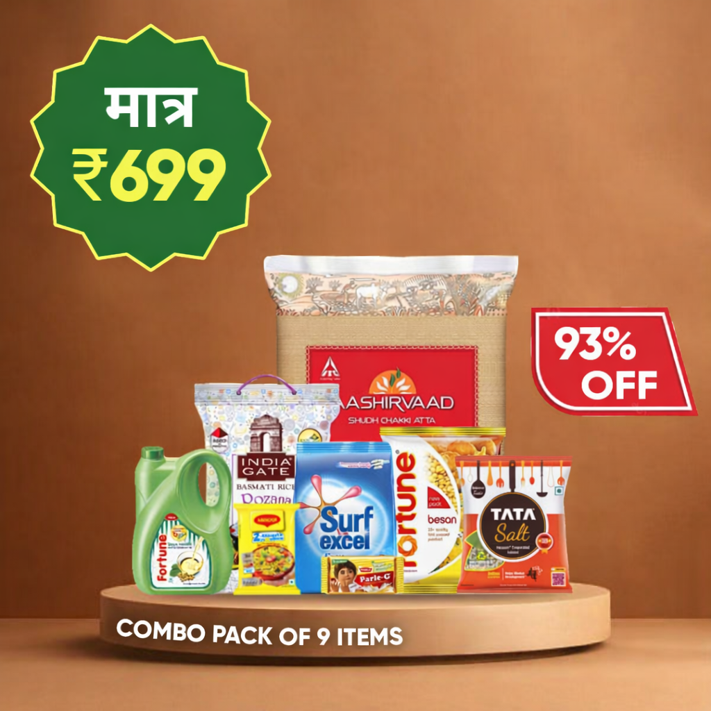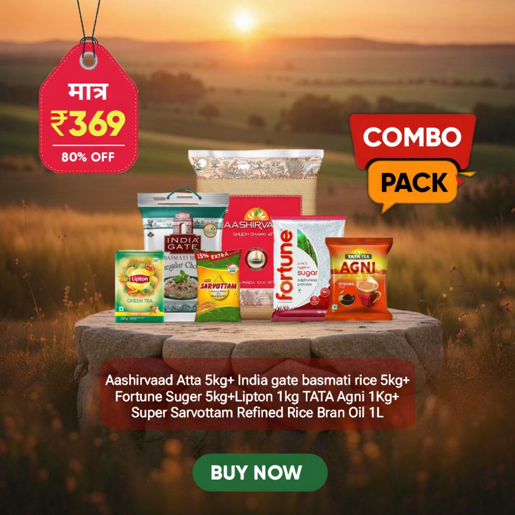 Aashirvaad Atta 5kg, India gate basmati rice 5kg, Fortune Suger 5kg, Lipton 1kg TATA Agni 1Kg, Super Sarvottam Refined Rice Bran Oil 1L
