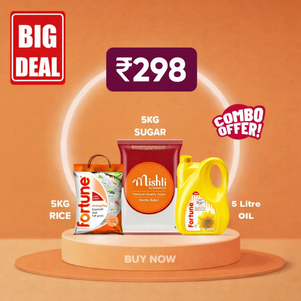 Blinkit Offer today: Combo of 5 kg Fortune oil+ 5 kg sugar+ 5 kg Basmati rice